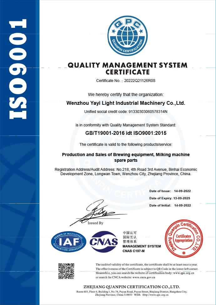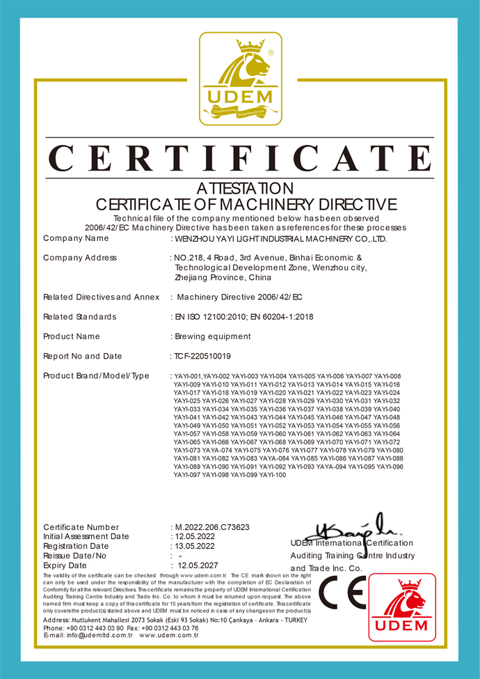 Wenzhou YAYI Light Industrial Machinery Co., Ltd. was founded in 2012, Our company has been engaged in food and beverage machinery for over 10 years. The Corporation's main business product includes: Alcohol Stills ,Beer Brewery Equipment, Essential Oil stills&Herb Oil stills ,Evaporator&Extractor ,boiler&kettle,fermenter,mash tun and pump ,valves etc.custom-made and design drawings is our core competitiveness,we also provide professional installation 3D drawings.